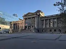 In 1983 the museum was relocated to its present location, the former provincial courthouse.[7] The building continues to be owned by the Government of British Columbia, although the museum occupies the building through a 99-year sublease signed with the City of Vancouver government in 1974;[9] who in turn leases the building from the provincial government.[10] Before the re-purposed building was opened to the public, it was renovated by architect Arthur Erickson at a cost of CA$20 million, as a part of his larger three city-block Robson Square redevelopment.[8] The gallery connects to the rest of Robson Square via an underground passage below Robson Street.