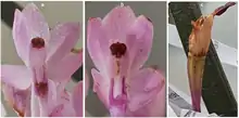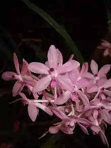 It has a monopodial growth habit. The leaves are remarkable, as they are unusually purple for a Vanda. The purple foliage permits this plant to grow in full sun, as the accumulation of anthocyanins near the plant surface filters light and improves photoprotection.[3] This feature is also strongly expressed in hybrids. The flowers are rose or purple to white and are produced on 2-4 relatively short, densely many-flowered inflorescences.[2]