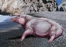 Desmostylus was a large, hippopotamus-like creature, with the adult Keton specimen of D. hesperus measuring 275 cm (9.02 ft) in length, 105 cm (3.44 ft) in height and 1,283 kilograms (2,829 lb) in body mass; the largest known humerus which is 1.3 times that of the Keton specimen in length probably belonged to an individual with a mass of 2.8 metric tons (3.1 short tons).[3] It had a short tail and powerful legs with four hooves. Both the creature's jaws were elongated and sported forward-facing tusks, which were elongated canines and incisors.[4]