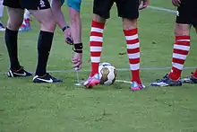 Used mainly at the highest levels of competition, vanishing spray is said to help prevent unnecessary delays by preventing the defensive team from encroaching closer than the mandated 10 yards (9.15 meters) from the ball during a free kick, and also by preventing the attacking team from illegally moving the ball from the spot where the referee awarded the kick.[1] Its use in football is not regulated by the Laws of the Game, with authorisation being in the hands of the governing body of a match, league, or tournament.