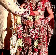 A varamala (Sanskrit: वरमाला, romanized: Varamālā, lit.'boon garland')[1] or a jayamala (Sanskrit: जयमाला, romanized: Jayamālā, lit.'victory garland')[2][3] is a South Asian garland that is most commonly associated with its eponymous ritual during a Hindu wedding ceremony.[4] Traditionally, a varamala is made of roses and other flowers,[5] though modern variations exist, such as garlands made from rupee notes, and other regional traditions.