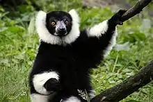 The black-and-white ruffed lemur (Varecia variegata) is an endangered species of ruffed lemur, one of two which are endemic to the island of Madagascar. Despite having a larger range than the red ruffed lemur, it has a much smaller population that is spread out, living in lower population densities and reproductively isolated. It also has less coverage and protection in large national parks than the red ruffed lemur. Three subspecies of black-and-white ruffed lemur have been recognized since the red ruffed lemur was elevated to species status in 2001.[6]