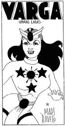 Varga is a Filipino comics superhero created by Mars Ravelo. He wrote and illustrated Varga for Bulaklak Magazine, appearing first in the magazine's No. 17, Vol. 4 (July 23, 1947) issue. A falling out with some of the magazine's editors caused Ravelo to resign from Bulaklak and transfer to Pilipino Komiks (Ace Publications), where he re-launched his superhero. Ravelo renamed her Darna, an anagram of the superhero's mortal alter-ego name Narda. Darna's adventures in Pilipino Komiks began in the No. 77 (May 13, 1950) issue, where she was illustrated by Nestor Redondo.[1][2]