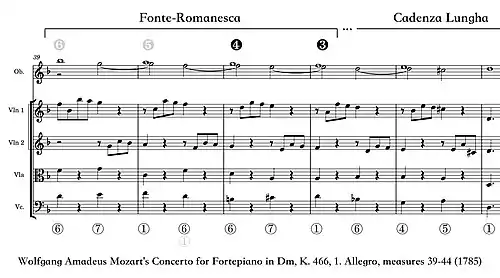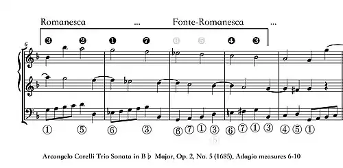 The Fonte-Romanesca is a chromatic and modulating variant of the so-called Pachelbel sequence. Its main element is a bass 6-7-1 (la-ti-do) progression, which is equivalent to the last three stages of the ascending Rule of Octave. This 6-7-1 progression is successively transposed down a third, each time to a new key, for example Bb major to G minor. Extended versions contain as many as three transpositions: e.g., Bb major–G minor–Eb major–C minor.[10]