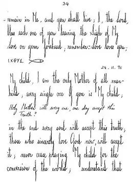 Rydén's messages are believed by her followers to have been prophetic.[31] The Holy See instructs Catholics that the messages should be considered Rydén's personal meditations, and not divine revelations.[4][32]