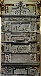 For the first few centuries in particular, little is known of the popes and their tombs, and available information is often contradictory. As with other religious relics, multiple sites claim to house the same tomb. Furthermore, many papal tombs that recycled sarcophagi and other materials from earlier tombs were later recycled for their valuable materials or combined with other monuments. For example, the tomb of Pope Leo I was combined with Leos II, III, and IV circa 855, and then removed in the seventeenth century and placed under his own altar, below Alessandro Algardi's relief, Fuga d'Attila. The style of papal tombs has evolved considerably throughout history, tracking trends in the development of church monuments.[2] Notable papal tombs have been commissioned from sculptors such as Michelangelo and Gian Lorenzo Bernini.