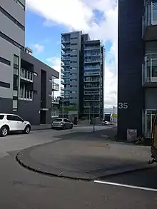 Vatnsstígur 16-18 is a residential tower located in downtown Reykjavík, Iceland. It is a part of a larger project called "shadow district" (Icelandic: Skuggahverfi) under phase 2.[1] This tower is the tallest residential tower in Reykjavík, standing 69.35 m (227.5 ft) tall.[2] construction of phase 2 was delayed due to the financial crisis in 2008, and therefore was not completed on schedule.