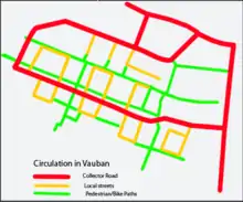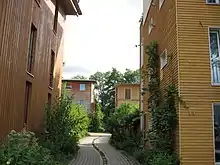 Most of Vauban's residential streets are described as stellplatzfrei – literally "free from parking spaces".[9] Vehicles are allowed down these streets at walking pace to pick up and deliver but not to park, although there are some infractions as the system depends essentially on social consensus – there are few official controls.[9] Each year, households are required to sign a declaration stating either that they do not own a car, or that they do, in which case they must buy a space in one of the multi-storey car parks on the periphery, at a one-off cost of €17,500 plus a monthly service fee (in 2006).[10][9] According to Melia (2006), "the citywide car sharing club has the greatest concentration of its 2,500 members in Vauban – at least ten of its cars are stationed around the district."[11]