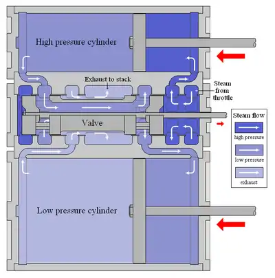 The key to the Vauclain compound is its valve system. In essence, there is an extra system of valves, concentric with the usual middle steam passage in conventional single expansion piston valves.[3] This passage connects the high-pressure cylinder exhaust to the low-pressure cylinder intake. The driving pistons are rigidly connected to either side of the crosshead, so that they move in concert. As high-pressure steam is admitted to one side of the high-pressure cylinder, the low-pressure steam exhausted from the other side is passed through the valves to the opposite side of the engine and into the low-pressure cylinder; finally the exhaust steam from the opposite side of the low-pressure cylinder escapes through the center part of the valve to the blastpipe.[4]