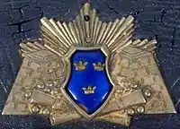 Vaxholm Artillery Corps, the first fortress artillery corps in Sweden,[2] originated in 1794 from a company of Svea Artillery Regiment (No 1) placed in Vaxholm, which together with the fortress company of Göta Artillery Regiment (No 2) formed Vaxholms Artillery Corps (No 5) on 1 January 1901 after a parliament decisions two years earlier.[2][3][4] The corps was located at Vaxholm Fortress and Oskar-Fredriksborg Fortress on Rindö and consisted of 23 officers, 25 non-commissioned officer, two civilian and 400 men divided into four companies.[2] The crew was enlisted with the addition of military men from the coast of Roslagen and Stockholm.[4] Its commanding officer was also commandant at both fortresses, belonged to the 4th Military District and the 4th Division.[2]