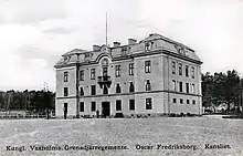 The regiment was originally placed in the Life Guards of Horse's (K 1) old barracks in Stockholm, but moved already in 1906 to Rindö east of Vaxholm.[4] The regimental barracks for I 26 on Rindö was completed in 1907 after Erik Josephson's drawings for the Swedish infantry. In 1941, the barracks of Vaxholm Grenadier Regiment became part of Vaxholm Coastal Artillery Regiment (KA 1).[7]