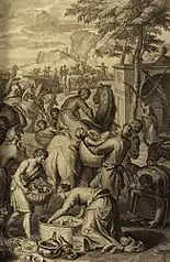 In the sixth reading, Jacob set his sons and his wives on camels and headed out toward Isaac and Canaan with all the animals and wealth that he had collected in Padan-aram.[68] Jacob tricked Laban by fleeing secretly while Laban was out shearing his sheep, and Rachel stole her father's idols.[69] On the third day, Laban heard that Jacob had fled and he and his kin pursued after Jacob seven days, overtaking him in the mountain of Gilead.[70] God came to Laban in a dream and told him not to speak to Jacob either good or bad.[71] But when Laban caught up with Jacob, he asked Jacob what he meant by carrying away his daughters secretly, like captives, without letting him kiss his daughters and grandchildren goodbye.[72] Laban said that while he had the power to harm Jacob, God had told him the previous night not to speak to Jacob either good or bad, and now Laban wanted to know why Jacob had stolen his gods.[73] Jacob answered that he fled secretly out of fear that Laban might take his daughters by force, and not knowing Rachel stole the gods, he told Laban that whoever had his gods would die.[74] Laban searched Jacob's tent, Leah's tent, and the two maid-servants' tent, finding nothing, and then he entered Rachel's tent.[75] Rachel had hidden the idols in the camel's saddle and sat upon them, apologizing to her father for not rising, as she was having her period.[76] Laban searched and felt about the tent, but did not find the idols.[76] Angered, Jacob questioned Laban what he had done to deserve this hot pursuit and this searching.[77] Jacob protested that he had worked for Laban for twenty years, through drought and frost, bearing the loss of animals torn by predators, and not eating Laban's rams, only to have his wages changed ten times.[78] Had not the God of Isaac been on Jacob's side, surely Laban would have sent Jacob away empty, Jacob said, and God had seen his affliction and awarded him what he deserved.[79] The sixth reading ends here.[80]