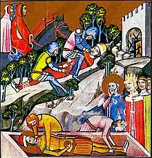 Emeric, the only son of King Stephen who survived infancy died in a hunting accident in 1031.[12][13] Although Vazul who was Stephen's closest agnatic relative had the strongest claim to succeed him on the throne, the king disregarded him and nominated his own sister's son, Peter Orseolo as his heir.[14] According to the nearly contemporaneous Annals of Altaich,[15] Vazul bitterly resented his omission, but he was blinded on King Stephen's order.[12] According to the contrasting reports of later Hungarian chronicles, written under kings descending from Vazul's line,[16] Stephen initially was planning to nominate Vazul as his heir, but Vazul's enemies, including Stephen's queen, Gisela[6] hatched a plot to hinder the king's plans.[17] They sent an "evil man" to Nyitra who "put out Vazul's eyes and filled the cavities of his ears with lead"[8] before the king's envoys arrived.[17]