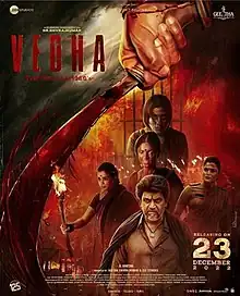 Vedha[2] is a 2022 Indian Kannada language action drama film written and directed by Harsha, and produced by Geeta Shivarajkumar under the banner Geeta Pictures in association with Zee Studios.[3] The film stars Shiva Rajkumar and Ganavi Laxman are in the lead roles and Umashree, Aditi Sagar, Shwetha Chengappa and Kuri Prathap in supporting roles.[4][5] The film marks Shiva Rajkumar's 125th film and was released on 23 December 2022, coinciding with Christmas, where it received positive reviews from critics.[6]