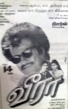 Veera (transl. Hero)[lower-alpha 1] is a 1994 Indian Tamil-language romantic comedy film[2] directed by Suresh Krissna and written by Panchu Arunachalam. It is a remake of the Telugu film Allari Mogudu (1992) and stars Rajinikanth, Meena and Roja with Janagaraj, Senthil, Vadivukkarasi, J. Livingston, Mahesh Anand, Vinu Chakravarthy, Ajay Rathnam, Vivek and Charuhasan in supporting roles. The film is about a man who marries twice because of circumstances beyond his control and is forced to live a double life to cover his tracks.