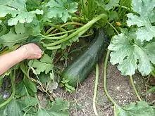 A marrow is a fruit used as a vegetable, the mature fruit of certain Cucurbita pepo cultivars. The immature fruit of the same or similar cultivars is called courgette (in Britain, Iran, Ireland, France, the Netherlands, Singapore, Malaysia and New Zealand) or zucchini (in North America, Japan, Australia, the Czech Republic, Italy, Germany and Austria).[1] Like courgettes, marrows are oblong, green squash, but marrows have a firm rind and a neutral flavour ("overgrown when picked and insipid when cooked"),[1] making them useful as edible casings for mincemeat and other stuffings.[2] They can be stored for several weeks after harvest (like pumpkins and other winter squash), to be processed for food when required.[3] They are a vegetable used in Great Britain and areas with significant British influence, though their popularity is waning in favor of immature summer squash like courgette.[1]