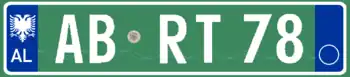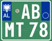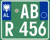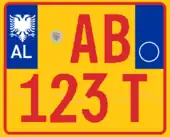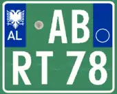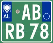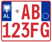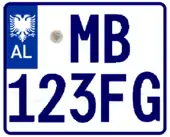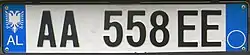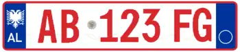 A new format similar to the post-1994 Italian and post-2009 French plate designs has been introduced since 16 February 2011.[1] The plates start with a blue strip at the left with 'AL' and redesigned double-headed eagle in white, 2 serial letters, security hologram, 3 digits, 2 serial letters on a rectangular white background, and end on the right with a blue strip that's supposed to show year of registration and regional code in white on. It has been observed that the last two identification elements are de facto not included while the font is more emphasized than the post-2002 one.[2] Plates of all vehicles would experience a similar change.[3] Critics claim that the color of the double headed eagle and strip is not representative of red and black colors of the Albanian flag.