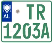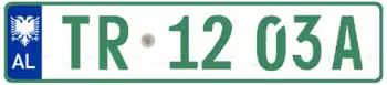 Diplomatic service vehicle registration plates in Albania have green borders and green texts on a white background. They do not have the blue strip on the right hand-side of the plate, unlike private vehicle registration plates. They follow the format [TR 00 00A], where TR stands for Truproje Diplomatike, which means "Diplomatic Bodyguards" in Albanian. The first 2 digits of the license plate refer to the Diplomatic license plate codes.