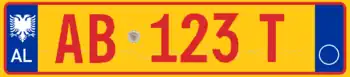 Taxi registration plates in Albania have red borders and red texts on a yellow background. They follow the format [AA 000 T], where T stands for Taxi.