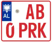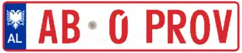 Test Vehicle registration plates in Albania have red borders and red texts on a white background. They follow the format [AA 0 PROV], where PROV stands for Provë which means Test.