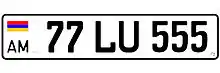Vehicle registration plates of Armenia have black characters on a rectangular white background. They are composed of two or three numbers, two letters (smaller than the digits) in the middle, and two (or three) other numbers. At the left side is located the international code "AM" with an oval car plaque and, sometimes, the national flag. Starting from 6 August 2014 a new design of license plates was implemented.[1] The license plates have a national flag on the left side, a security hologram and a machinery readable Data Matrix Code.