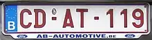 Temporary registration plates are issued for vehicles intended for export, either by companies or individuals. They are in a pattern generally reminiscent of other Belgian plates, but with white characters on a red background.