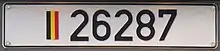 White plate with black numbers and a Belgian flag on the left. The NATO Headquarters formerly used a red plate with the white letters SB (later M) followed by a number.
