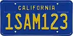 The California Legacy License Plate program offers vehicle owners the opportunity to purchase replicas of California license plates similar to those issued in the 1960s. California proposed issuing plates similar to those of the 1950s, 1960s and 1970s. The original plan was to restrict the plate colors to what would have been issued to the vehicle when purchased new. After a few months, the program was opened to all model years. Only the 1960s (gold on black) plate reached the required 7,500 minimum orders before January 1, 2015. The 1950s (black on gold) and 1970s (gold on blue) plates did not achieve the required 7,500 minimum orders.[31] The plates were issued from late spring through summer 2015 and, as of 2021, are still available for order from the DMV website. Additional time is required for personalized plates.[32][33]
