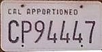 1905–13 | Black on white; "CAL" at right | 123456 | 1 to 122444 | A one-time $2.00 fee is paid to register the vehicle, and the motorist must have a license plate made to hang from the rear of the vehicle (front plate also required starting in 1911). These plates were valid from the date of issuance until no longer needed for that car. The seal (disc) that the motorist received from the state with the registration number, along with the license plate(s), was supposed to remain with the vehicle upon transfer to a new owner, but that did not always happen. These early plates were valid through December 31, 1913.[5][6] |