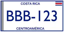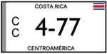 Costa Rica requires its residents to register their motor vehicles and display vehicle registration plates.[1] The country has issued plates since at least 1923. The letters "CR" on plates into the early 1940s indicated the country name. The country name has been spelled out on the plates since at least 1944. In 1959 the legend "Centro America" [Central America] has appeared on the plates. Annual plates appear to have been issued through at least 1954. There were plates where the first two characters indicated what city the owner lived in. Multi-year base plates began to appear in 1955, but their use was not consistent until the mid-1960s. The current plate size is the North American standard of 6 × 12 inches (152 × 300 mm).[2]