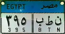 Egyptian vehicle registration number plates are used for official identification purposes for motor vehicles in Egypt. The international vehicle registration code for Egypt is ET.