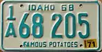 1968–70 | Embossed green serial on white plate with border line; "IDAHO 68" centered at top | "FAMOUS POTATOES" centered at bottom | A 12345 0/A 12345 1/A A1234 |
