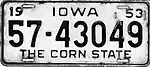 1953–55 | Embossed black serial on white plate with border line; "IOWA" centered at top; "19" at top left and "53" at top right | "THE CORN STATE" centered at bottom | 1-12345 10-12345 |