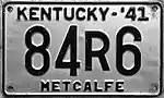 1941 | Embossed black serial on silver plate with border line; "KENTUCKY-'41" and county name centered at top and bottom respectively | none | 12345 A1234 1A234 12A34 123A4 |