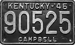 1946–47 | Embossed silver serial on black plate with border line; "KENTUCKY-'46" and county name centered at top and bottom respectively | none | 123-456 | Issued in blocks by county | Revalidated for 1947 with windshield stickers. |