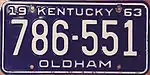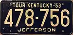 1953 | Embossed white serial on dark blue plate; county name centered at bottom | "TOUR KENTUCKY-'53" centered at top | 123-456 | Issued in blocks by county | |