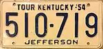 1954 | Embossed dark blue serial on white plate; county name centered at bottom | "TOUR KENTUCKY-'54" centered at top | 123-456 | Issued in blocks by county | |