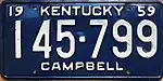1959 | Embossed white serial on dark blue plate; "19 KENTUCKY 59" at top; county name centered at bottom | none | 123-456 A12-345 |