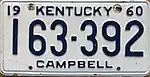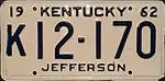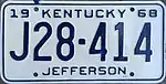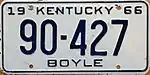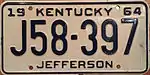 1964 | Embossed dark blue serial on white plate with border line; "19 KENTUCKY 64" at top; county name centered at bottom | none | 123-456 A12-345 |