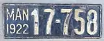 1922 | Embossed white serial on black plate with border line; "MAN 1922" at left | 12-345 | 1 to approximately 38-500 | |