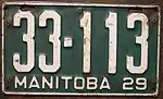 1929 | Embossed white serial on green plate with border line; "MANITOBA 29" at bottom | 12-345 | 1 to approximately 77-000 | |