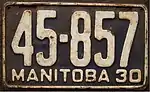 In 1956, Canada, the United States, and Mexico came to an agreement with the American Association of Motor Vehicle Administrators, the Automobile Manufacturers Association and the National Safety Council that standardized the size for licence plates for vehicles (except those for motorcycles) at 6 inches (15 cm) in height by 12 inches (30 cm) in width, with standardized mounting holes.[1] The first Manitoba licence plate that complied with these standards was issued 25 years beforehand, in 1931.