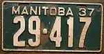 1937 | Embossed white serial on green plate with border line; "MANITOBA 37" at top | 12-345 | 1 to approximately 68-000 | |