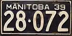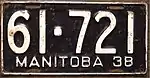 1938 | Embossed white serial on black plate with border line; "MANITOBA 38" at bottom | 12-345 | 1 to approximately 78-500 | |