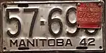 1942–44 | Embossed black serial on silver plate with border line; "MANITOBA 42" at bottom | 12-345 | 1 to approximately 84-000 | Revalidated for 1943 with red tabs, and for 1944 with windshield stickers, due to metal conservation for World War II. |