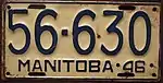 1946 | Embossed blue serial on cream plate with border line; "MANITOBA 46" at bottom | 12-345 | 1 to approximately 84-000 | |