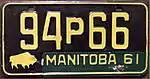 1958–63 | Embossed yellow serial on black plate with border line; "MANITOBA 58" at bottom, offset to right, with embossed bison graphic to left | none | 1A234 | 1A1 to 9Y999 |