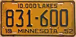 1952 | Embossed blue serial on gold plate with border line; "19 MINNESOTA 52" at bottom | "10,000 LAKES" centered at top | 123-456 | 1 to approximately 994-000 | |