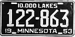 1953 | Embossed white serial on black plate with border line; "19 MINNESOTA 53" at bottom | "10,000 LAKES" centered at top | 123-456 1-234-567 |