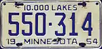 1954 | Embossed blue serial on cream plate with border line; "19 MINNESOTA 54" at bottom | "10,000 LAKES" centered at top | 123-456 1-234-567 |